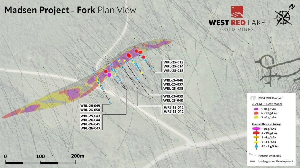West Red Lake Gold Mines Ltd. (“West Red Lake Gold” or “WRLG” or the “Company”) (TSXV: WRLG) (OTCQB: WRLGF) is pleased to announce results from the infill drilling program at its 100% owned Fork Deposit located approximately 250 metres (“m”) southwest from its Madsen Mine in the Red Lake Gold District of Northwestern Ontario, Canada.
