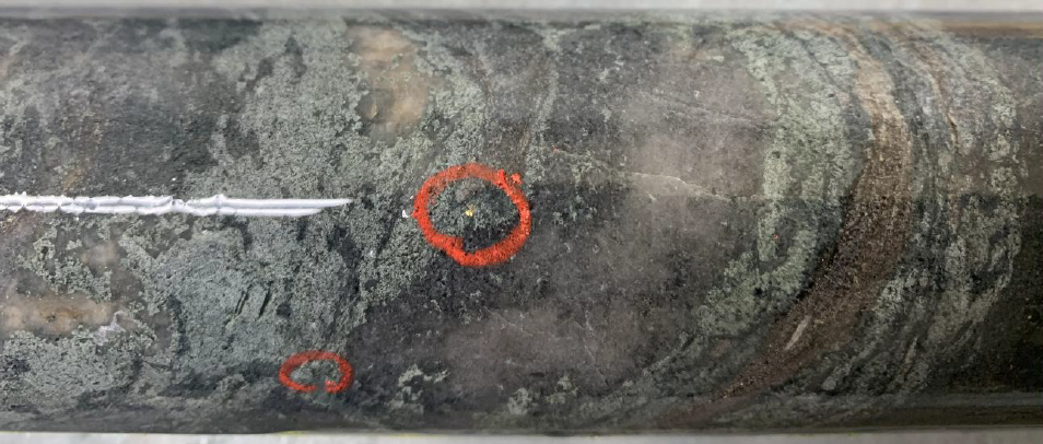 FIGURE 1. Multiple instances of visible gold in hole WRL-26-047 associated with quartz veining and pyrite + pyrrhotite. Drill core is NQ (47.6 mm) diameter.