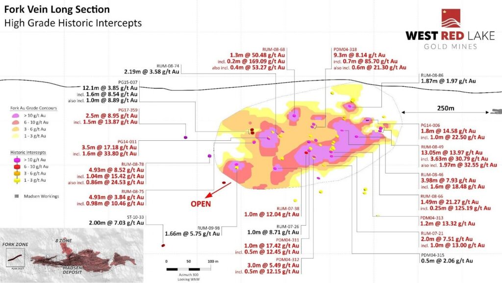 The Fork deposit currently contains an Indicated mineral resource of 20,900 ounces (“oz”) grading 5.3 grams per tonne (“g/t”) gold (“Au”) within 123,800 tonnes with an additional Inferred resource of 49,500 oz grading 5.2 g/t Au within 298,200 tonnes. West Red Lake Gold announced the interpretation of a high-grade core within this resource in December 2024 (news release available here).